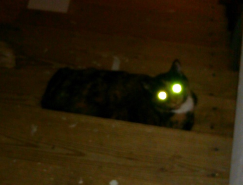 I think my deadly death-ray gaze is milder than theirs because I don’t want to incinerate my Mom. Even though I know she’s immune to feline death-rays and sad puppy-dog eyes, I don’t want to take any chances. She’s a really good Mom, after all.