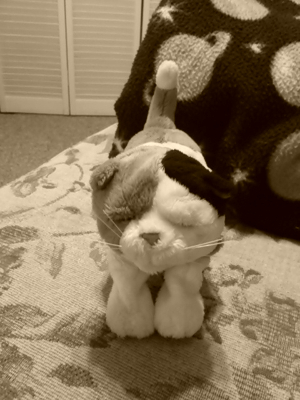 When MomGoth pushes a button, Clementine wags her rear end, closes and opens her eyes, and mews. After doing this a few times, she closes her eyes and purrs a few times and goes to sleep.