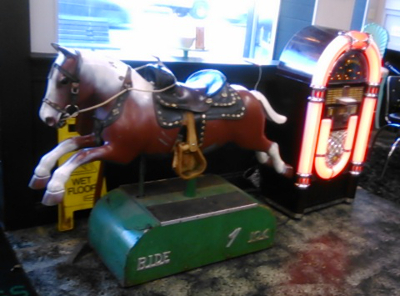 The “juke box” is actually a radio — tuned to the local channel, of course! The pony ride is FREE. Kids still love pony rides.