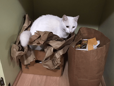 Momma got some books for something she calls Purr Bastet Publications. They come in boxes (not my sitting box — bo-ring) and they have brown paper stuffed in them. And Poppa stuffed that paper into my sitting box!