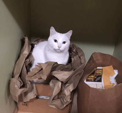 January 27, 2018 at 8:58amThis kind of paper seems to baffle him. It’s one big, long, crumpley thing, and he doesn’t seem to know what to do with it except ease it aside and sit in the midst of the coils.