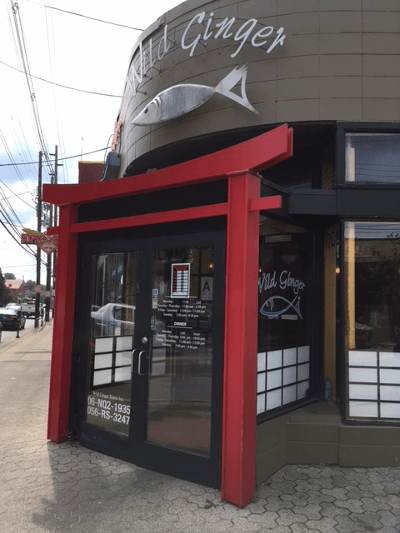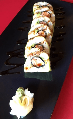 That’s called a Tiger Roll. Eee, I just went to the Wild Ginger web site and looked at the ingredients: Smoked salmon | cream cheese | avocado | wrapped in soy paper | eel sauce. I didn’t know about the eel sauce. That dark line around the center is a bit of seaweed, but much less that in a normal sushi roll.