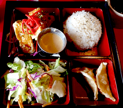 Clockwise, from upper right: sticky rice, gyoza (fried dumplings), salad with ginger dressing, fried tofu. Yes, even though there was meat on the menu, instinct told me to go for the tofu. I like good tofu A GREAT BIG LOT, and I was correct: even though Sara’s beef was aMAZing, the tofu (to my taste) was even better!