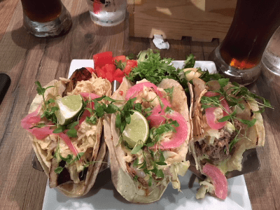 1 Brisket Taco, 1 Pork Belly Taco, 1 Shrimp Taco, Grilled Corn Tortillas, Bacon Apple Slaw, Pickled Onions, Spicy Avocado Crème Fraiche, Micro Cilantro, Lime $14